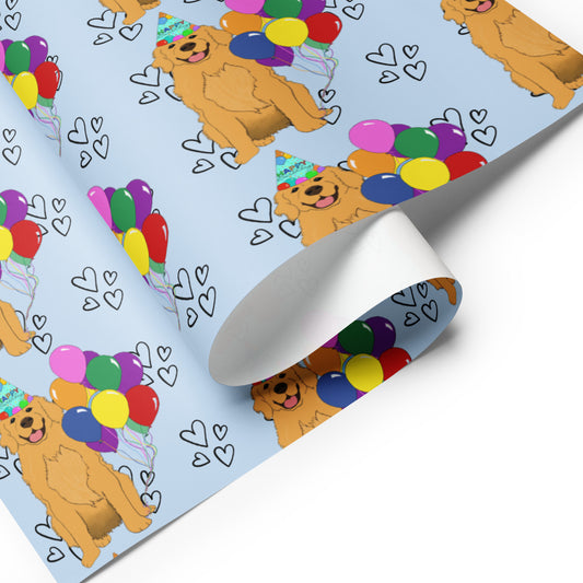 Golden Retriever Birthday Blue Heart Background Wrapping Paper Sheets
